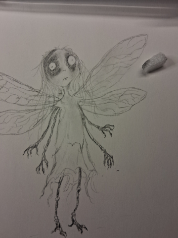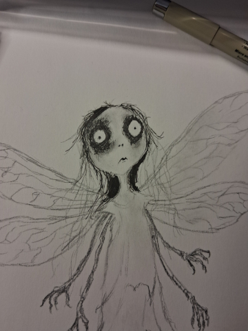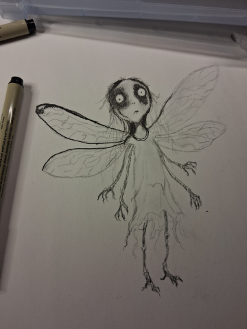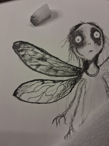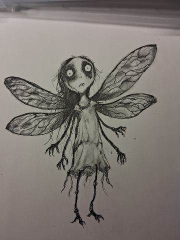 For those bored/curious enough to see how I made this. Pretty standard. I sketched in standard #2 pencil, then charcoal pencil, then ink (standard Amazon micro fineliners), rubbed charcoal into paper for shading and texture. Took pic w phone. Imported into Photopea (free knock off of Photoshop) to add my text and adjust size/colors/textures.