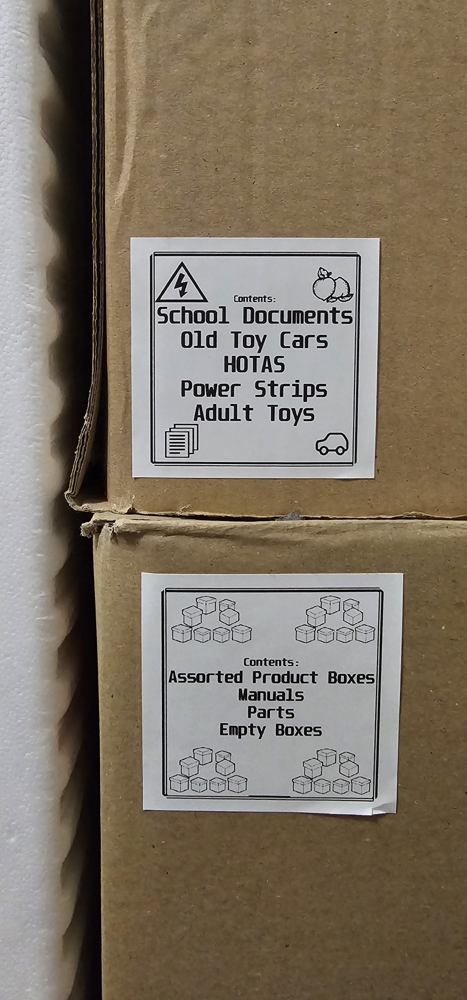 Here are some labels I threw together while I was roughly organizing things, I'm still new at it. I stuck one sticker on each of the four sides of the boxes.