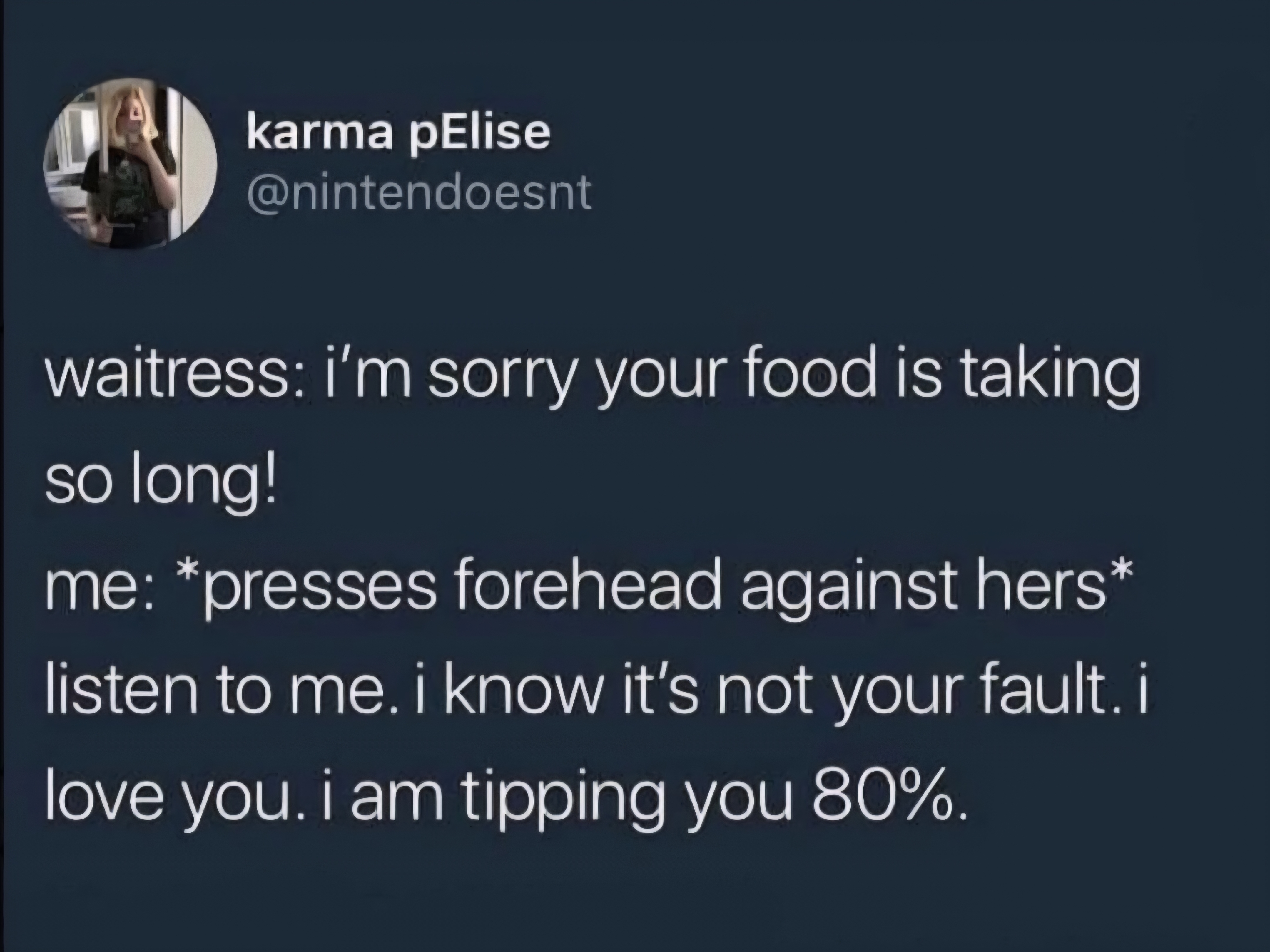 "I am tipping you 80% because I am going to skip out on the bill. Don't say anything, okay?"